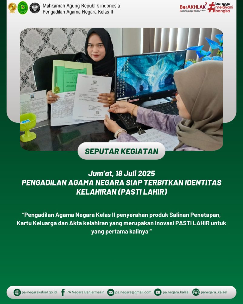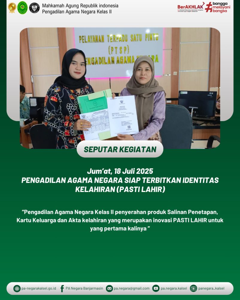 PENGADILAN AGAMA NEGARA SIAP TERBITKAN IDENTITAS KELAHIRAN (PASTI LAHIR)